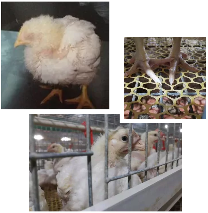 臨床上主要表現(xiàn)為采食不正常,刨料,愛吃細料;糞便不成形,消化不良,水便多,類似魚腸糞便、竹節(jié)糞便;雞群整體發(fā)育不整齊,形體瘦長,毛色晦澀無光,顏面灰白,腿及爪粉灰色漸漸蒼白色,細瘦無光澤,愛驚群瘋跑,也常縮頭耷尾;隨著病程發(fā)展,采食可能嚴重減少,有的甚至減少2/3,死亡增加。